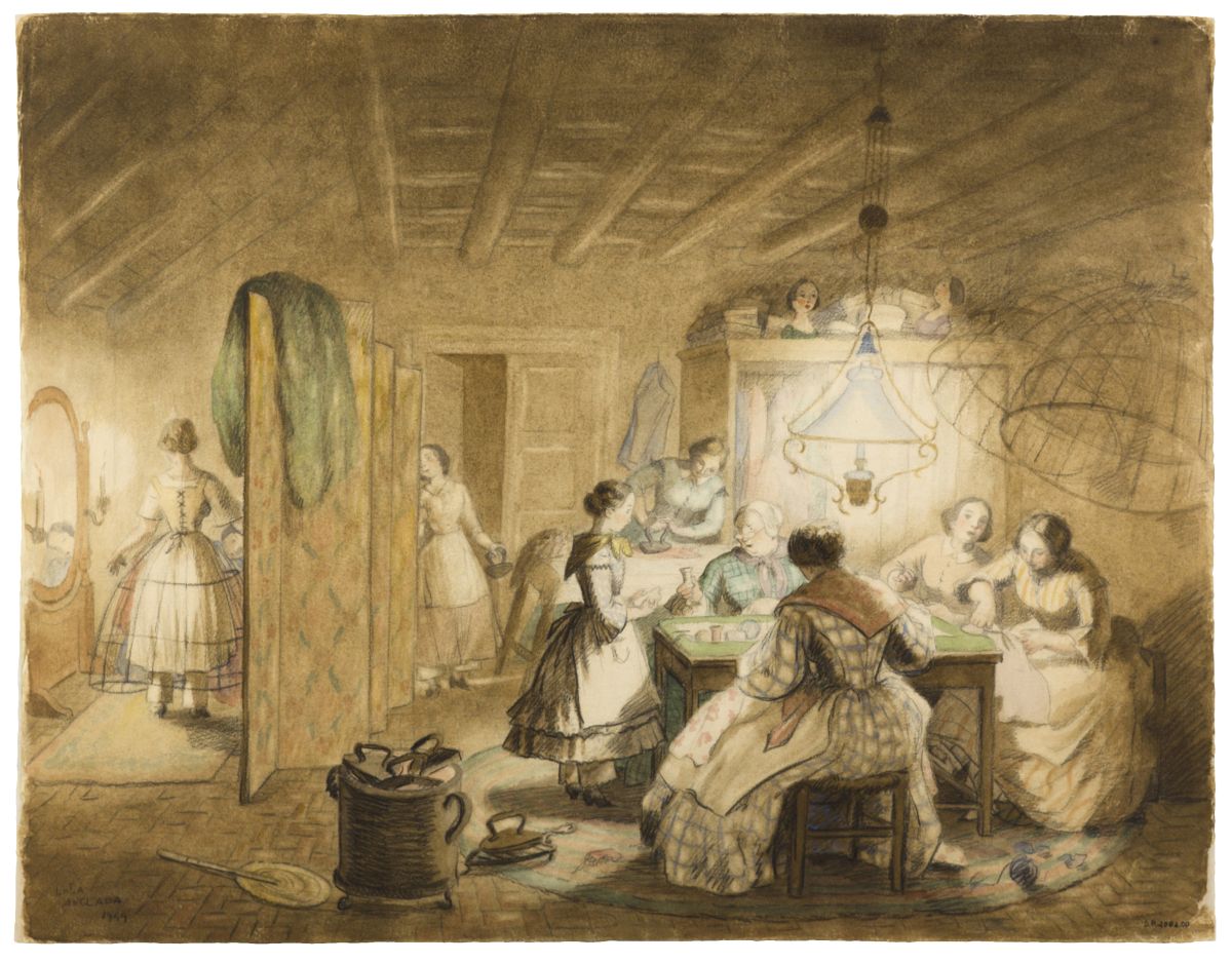 Ja al cim de la popularitat, seguirà obrint horitzons. El 1933 i a la Casa de l’Ardiaca de Barcelona, feu l’exposició «Visions de la Barcelona vuitcentista», amb originals que reconstruïen un tema de la seva preferència (el Vuit-cents català) i que havia desenvolupat marginalment. Molts dels útils, mobles, vestits i estris que dibuixa, els havia vist a la casa dels avis, on va viure de menuda. Coneixia per experiència i per gust personal el que configura l’atmosfera del Vuit-cents, un temps que li era familiar i benvolgut. L’èxit de l’exhibició a la Casa de l’Ardiaca la confirmà en el nou camí que emprenia. La precisió del dibuix i la capacitat per documentar-se feren d’ella la investigadora ideal del Vuit-cents català. Arran de l’exposició i, juntament amb l’historiador Francesc Curet, van iniciar un ambiciós projecte: Visions barcelonines (figura 4) en deu volums, una reconstrucció dels usos i costums de la Barcelona del Vuit-cents. Lola Anglada investigava, documentava i il·lustrava, i el text era a càrrec de Curet. L’esclat de la guerra d’Espanya interrompé el projecte i la repressió franquista posterior feren impossible l’edició, que només es començà a dur a terme a partir del 1952, amb dificultats materials de tota mena i sota censura.