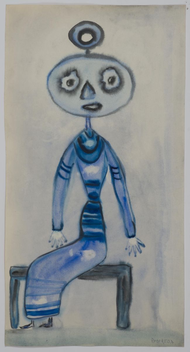 Les figures humanes de cos sencer que s’observen en les obres d’art de Rodoreda són força diverses, tot i que bona part presenten una sèrie de trets comuns, com l’ús de cercles concèntrics per als ulls i braços esquemàtics amb musculatura marcada. Rodoreda sovint no inclou mans en aquestes figures i, en el cas dels personatges femenins, les seves cabelleres s’allarguen més d’un costat que de l’altre. El seu estil es basa en la simplicitat de formes i colors, però aconsegueix transmetre una gran complexitat emocional, des de l’alegria fins a l’angoixa. Una de les sèries més emblemàtiques en què s’observen figures humanes de cos sencer és Camps de Concentració, que destaca per la seva estètica lúgubre i angoixant, amb colors grisos i marrons i figures que remeten a la temàtica dels camps, tal com indica el títol (figura 3).
