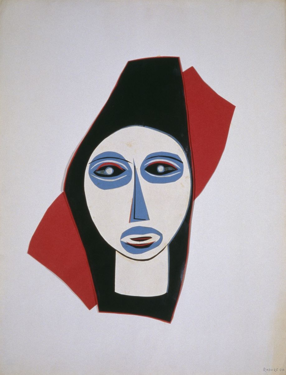 Una de les tècniques que Mercè Rodoreda va experimentar amb més llibertat va ser el collage, una tècnica que li permeté combinar materials i textures diverses amb una estètica atrevida. Molts dels seus collages se centren en la figura humana, amb rostres que presenten trets geomètrics com ulls formats per cercles concèntrics i boques fetes amb formes rectangulars o semicirculars. A més, alguns collages evoquen l’«art negre», ja que recorden les màscares africanes que van inspirar molts artistes d’avantguarda (figura 4).