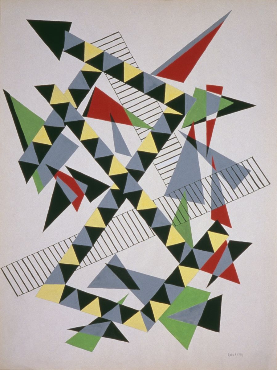 Finalment, la influència dels artistes d’avantguarda és evident en l’obra de Mercè Rodoreda, especialment la de Pablo Picasso, Joan Miró, Paul Klee i Vassili Kandinski. En alguns casos, la influència és tan evident que podem parlar directament d’imitacions, especialment de Picasso i Miró, fins al punt que en algunes ocasions va signar les seves obres amb els seus noms com a joc. La capacitat de Rodoreda per captar els estils d’aquests artistes va ser notable i en va saber integrar elements com els trets facials picassians o els personatges de les Constellations de Miró. També va explorar la vibrant paleta cromàtica de Klee i les formes geomètriques de Kandinski (figura 5), de manera que va consolidar un llenguatge artístic propi influenciat per les grans figures de l’avantguarda.