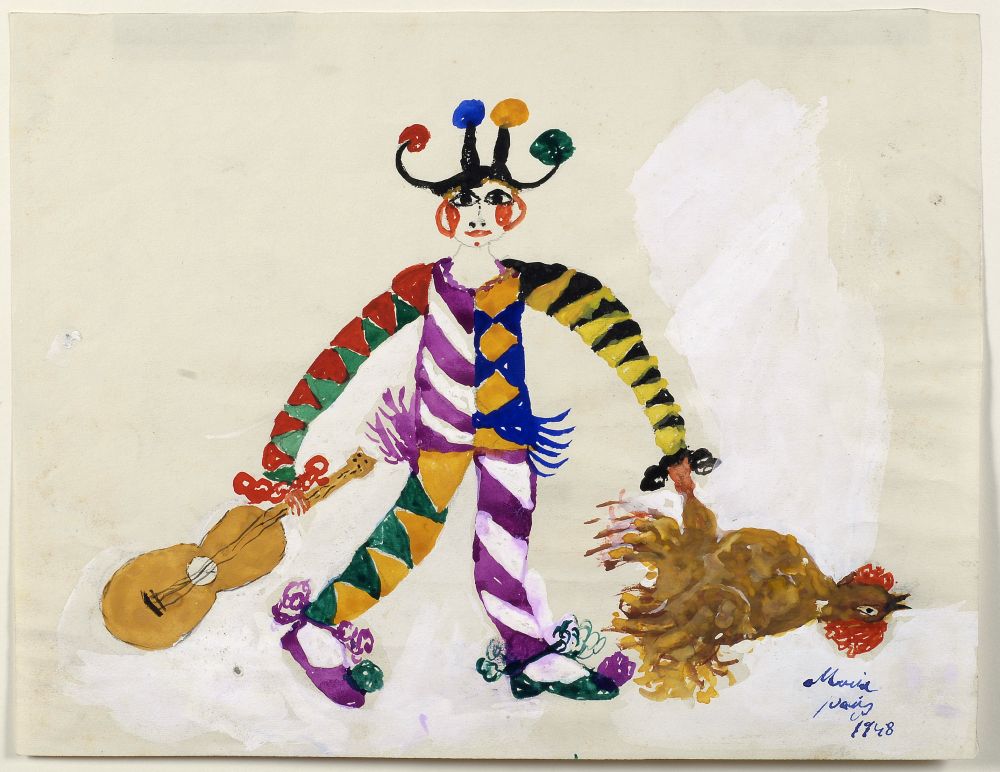 El museu compta, a més, amb una destacada col·lecció de dibuixos originals d’autors com Marià Fortuny (Gosset), Emili Castelucho i Diana (Can-can, 1900; figura 7), un dibuix de Rafael Solanic, vuit dibuixos del pintor Josep Miquel Serrano Serra —entre els quals hi ha Arlequí— i cinc guaixos de la pintora i ceramista Maria Sanmartí, com ara Pallasso (1948; figura 8). Completen el conjunt diverses escenes populars anònimes de La vida de sant Francesc, Sant Pere Nolasc, Sant Domènec i Sant Agustí, realitzades amb tremp sobre paper al segle xviii, així com alguns dibuixos d’autoria desconeguda, datats del segle xviii i els inicis del xix.