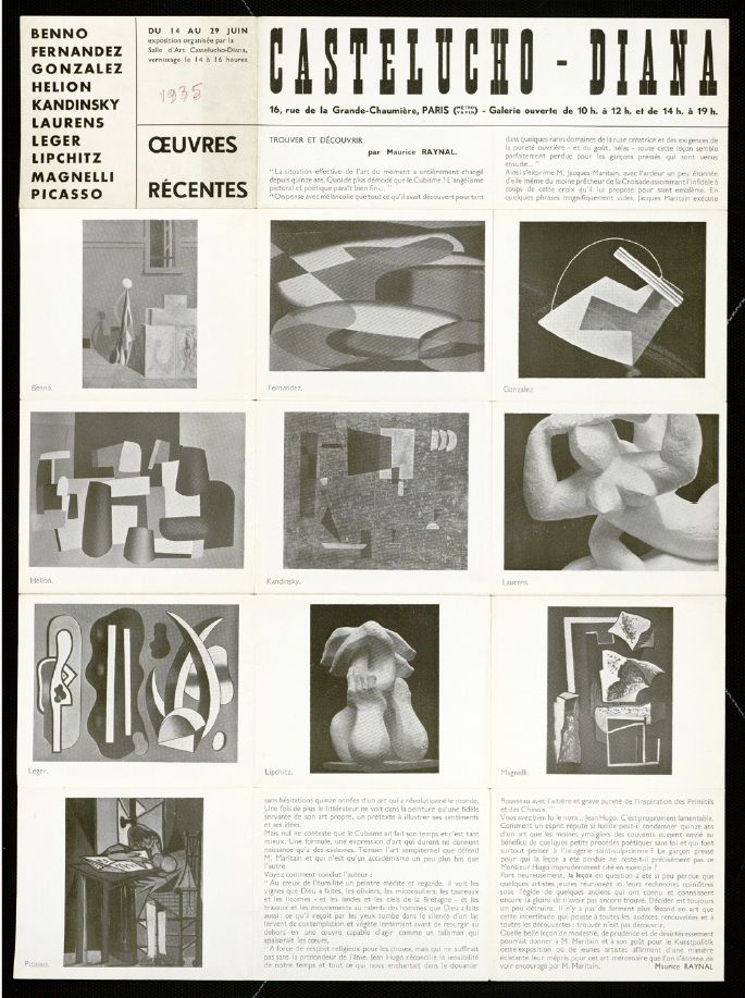 La primavera del 1935 s’inaugurà la mostra «Exposition de groupe avec 20 peintres», amb la participació d’artistes com Charles Camoin, Raoul Dufy, Othon Friesz, Michel Kikoïne, Suzanne Valadon i Kees van Dongen. Posteriorment, s’hi presentà Une œuvre, del pintor paisatgista francès Anders Osterlind. Poc després, entre el 14 i el 29 de juny de 1935, la Sala Castelucho acollí una exposició manifest d’artistes vinculats a l’abstracció (figura 4), alguns dels quals sota la influència del Cubisme, com Benjamin Benno, Luis Fernández, Julio González, Jean Hélion, Vassili Kandinski, Henri Laurens, Fernand Léger, Jacques Lipchitz, Alberto Magnelli i Picasso. El catàleg de la mostra incloïa un prefaci de Maurice Raynal.